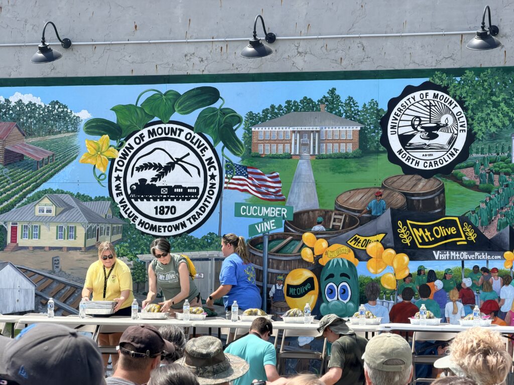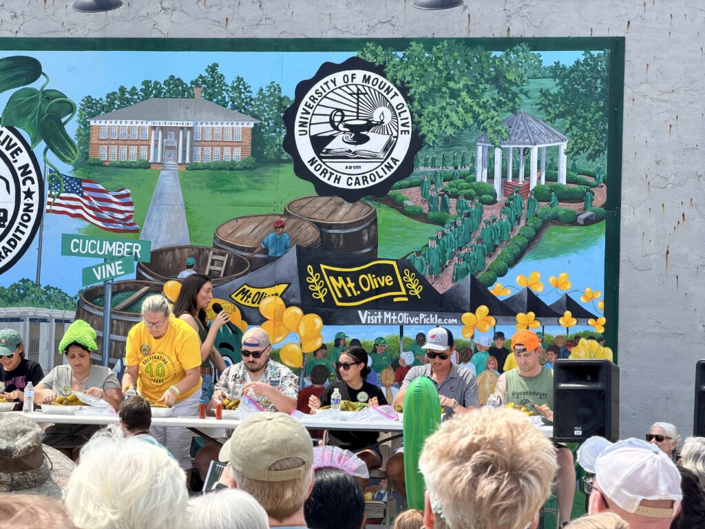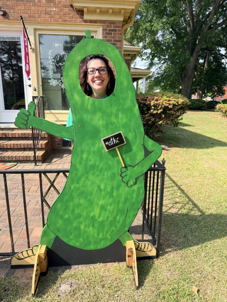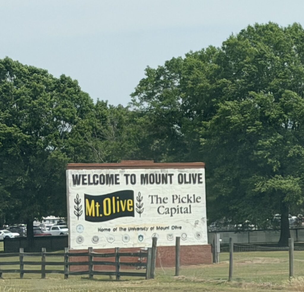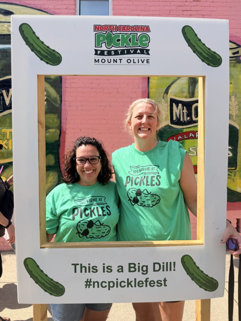 Today, I went with my friend Lecy to the Mount Olive Pickle Festival in Mount Olive, North Carolina. It was the 40th year for the festival and the 100th year for Mount Olive making pickles. I made us fun shirts to wear (which we were complimented on several times) and made a pair of pickle earrings for Lecy. There were a ton of people! Lots of vendors and lots of food/drink options. Every food/drink vendor had to have some kind of pickle option. Mount Olive was handing out free pickles! I did not feel compelled to try most of the pickle options from the vendors, like pickle lemonade, pickle cookies, or chocolate covered pickles, but we did try the dill pickle fudge. Surprisingly, it was not terrible. We watched the pickle eating competition where the contestants had 5 minutes to eat as many of the 20 pickles as they could. They were the great big pickles! The winner ate 11 pickles! We did not tour the After spending a couple of hours walking around the festival, we decided to have lunch outside of the festival to avoid some of the crowd and seek shade. I had so much fun hanging out with Lecy for the day.