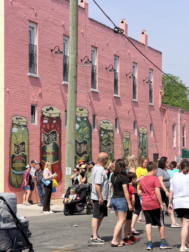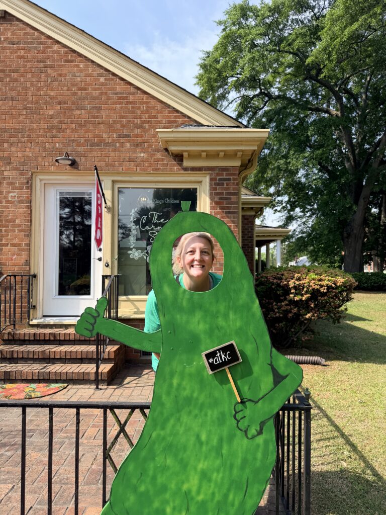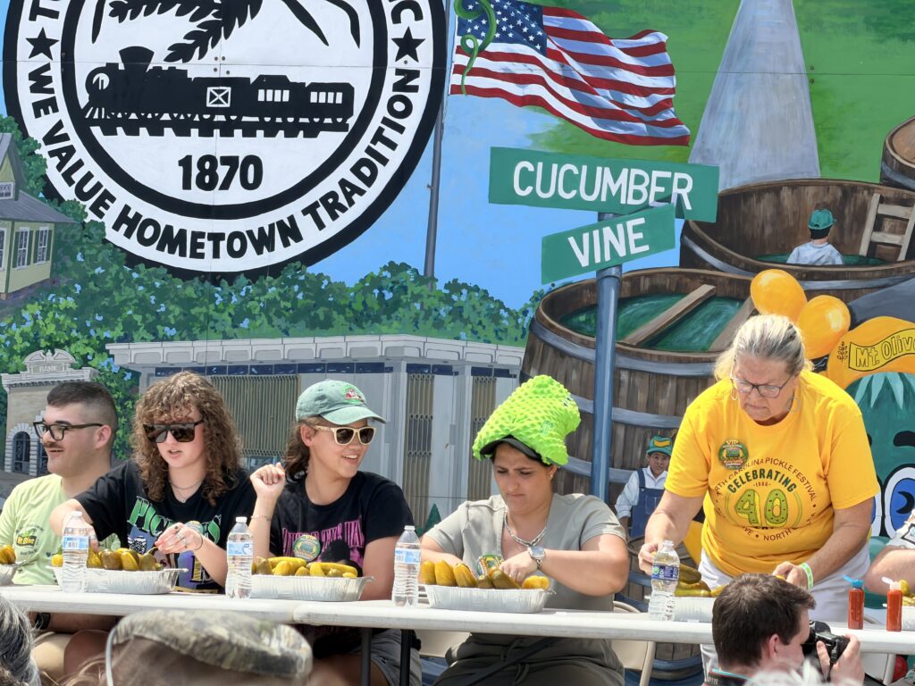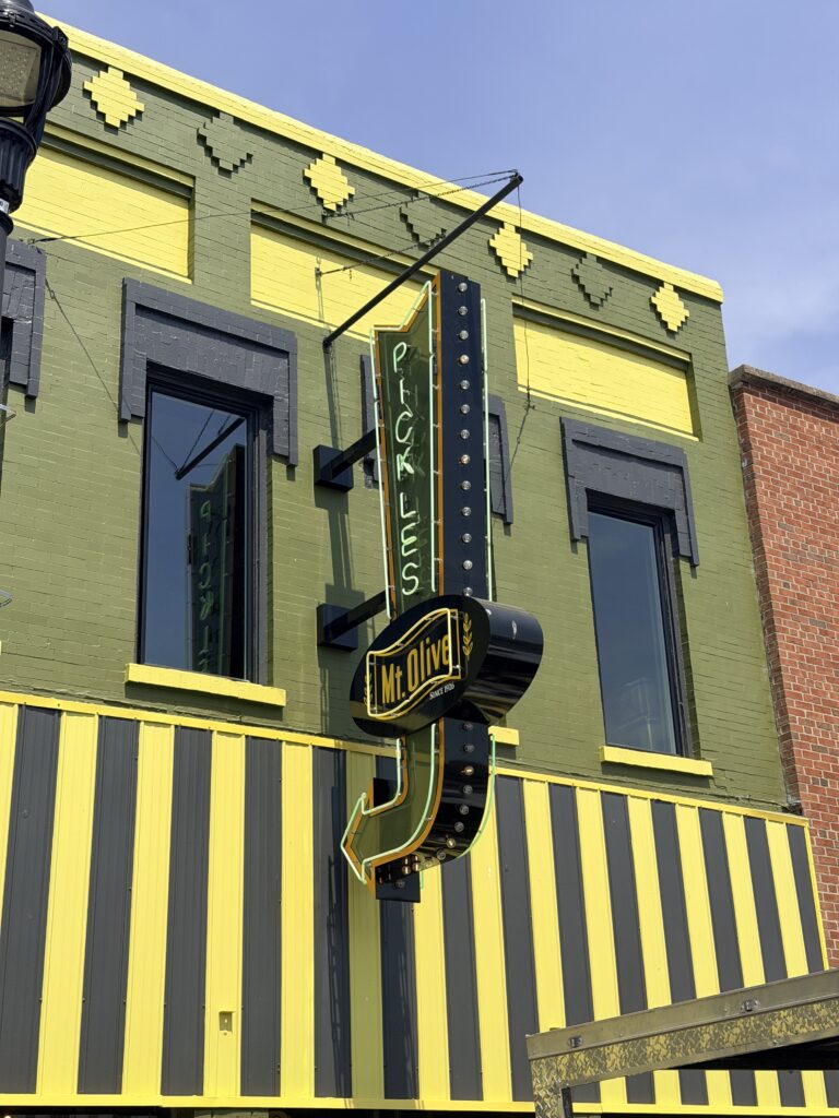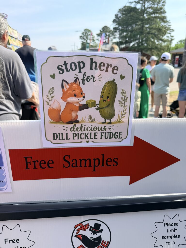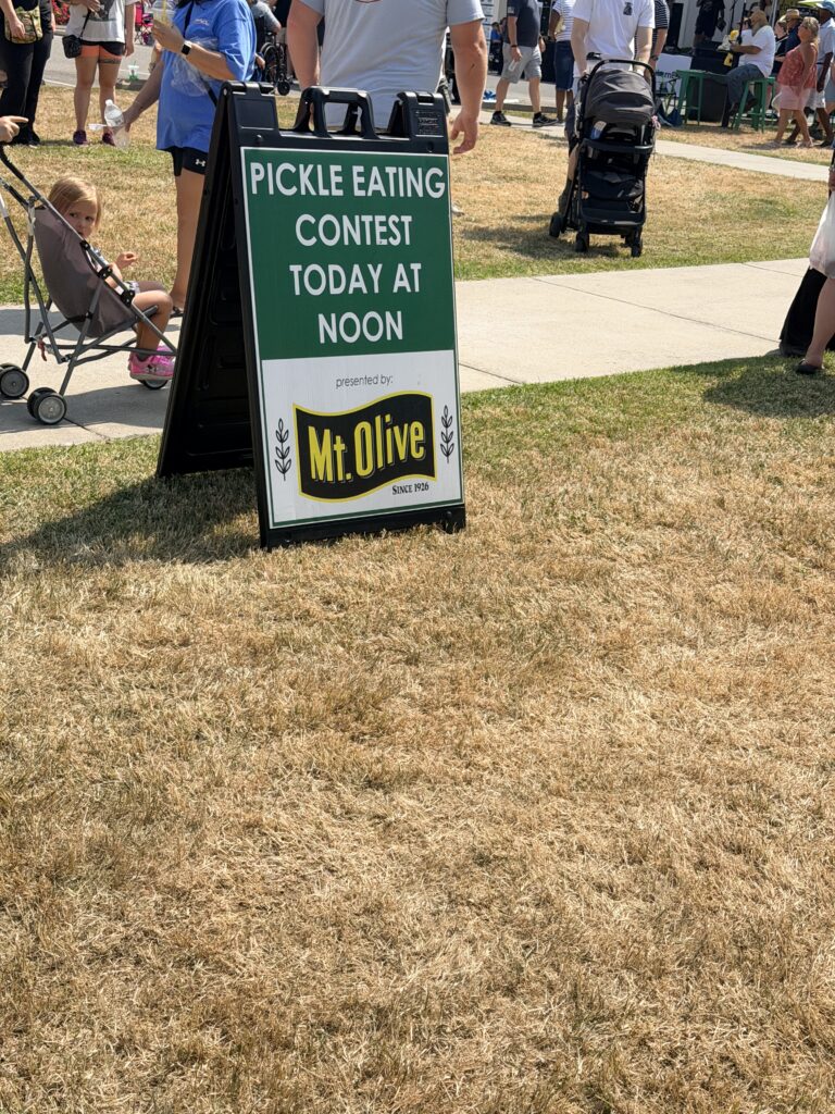 Today, I went with my friend Lecy to the Mount Olive Pickle Festival in Mount Olive, North Carolina. It was the 40th year for the festival and the 100th year for Mount Olive making pickles. I made us fun shirts to wear (which we were complimented on several times) and made a pair of pickle earrings for Lecy. There were a ton of people! Lots of vendors and lots of food/drink options. Every food/drink vendor had to have some kind of pickle option. Mount Olive was handing out free pickles! I did not feel compelled to try most of the pickle options from the vendors, like pickle lemonade, pickle cookies, or chocolate covered pickles, but we did try the dill pickle fudge. Surprisingly, it was not terrible. We watched the pickle eating competition where the contestants had 5 minutes to eat as many of the 20 pickles as they could. They were the great big pickles! The winner ate 11 pickles! We did not tour the After spending a couple of hours walking around the festival, we decided to have lunch outside of the festival to avoid some of the crowd and seek shade. I had so much fun hanging out with Lecy for the day.
