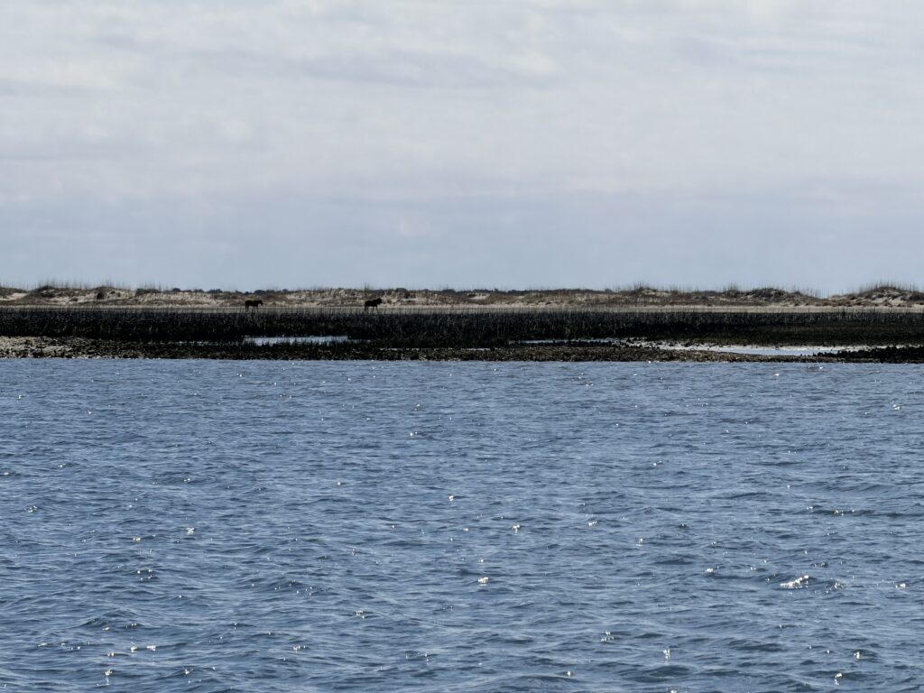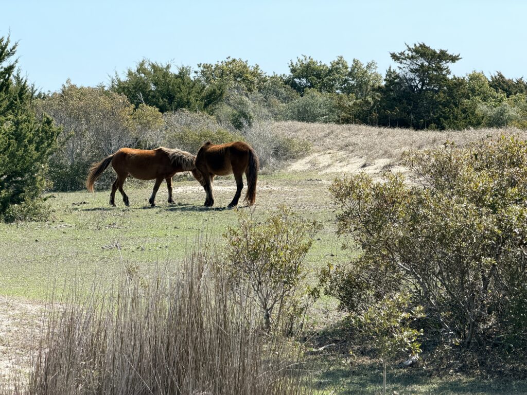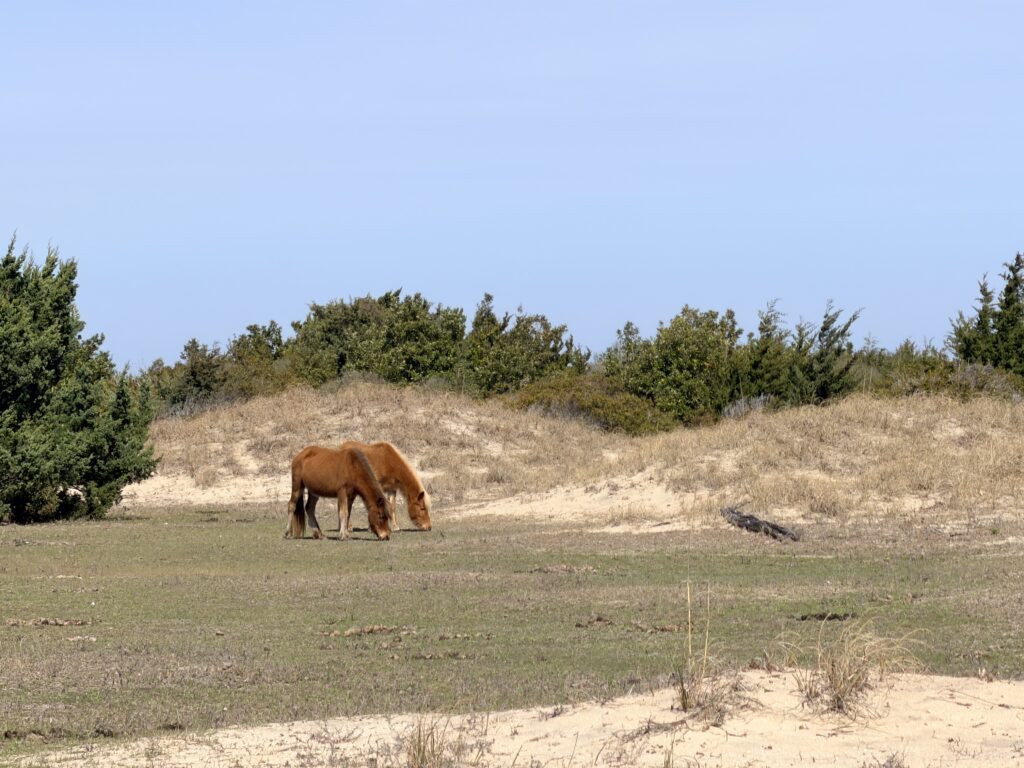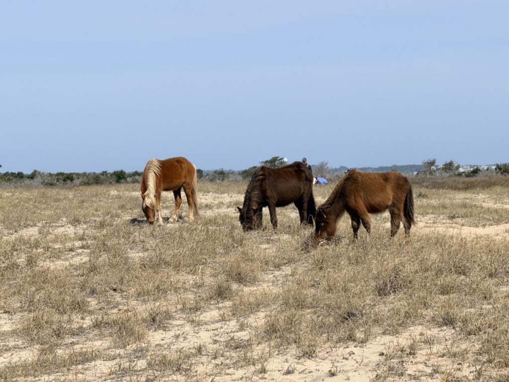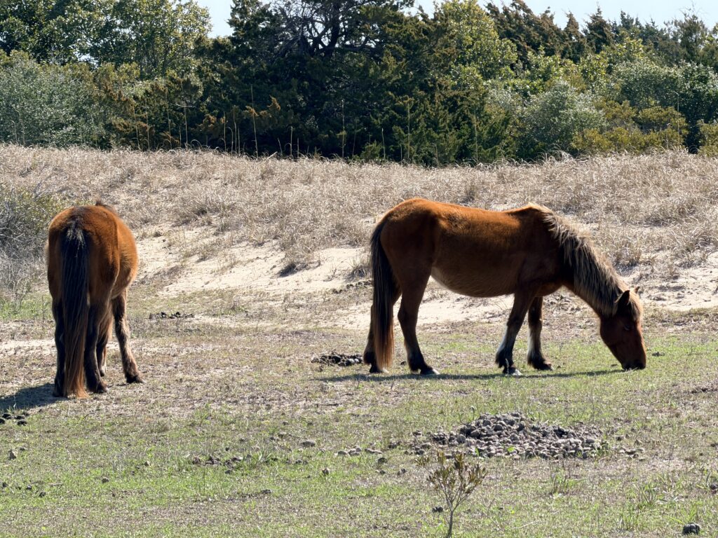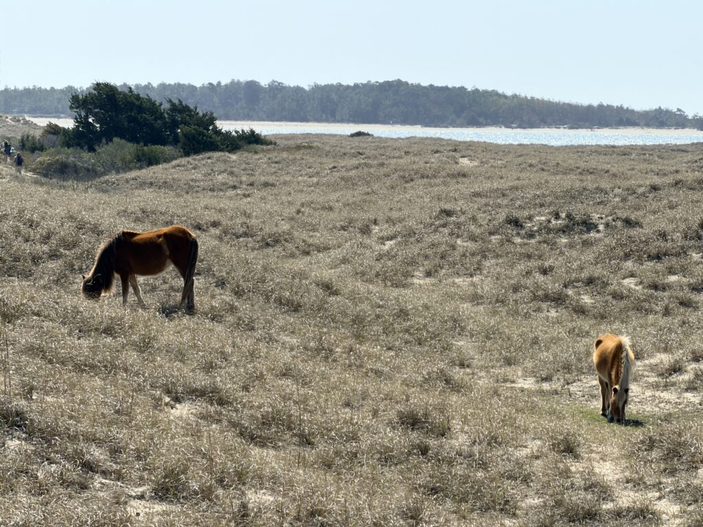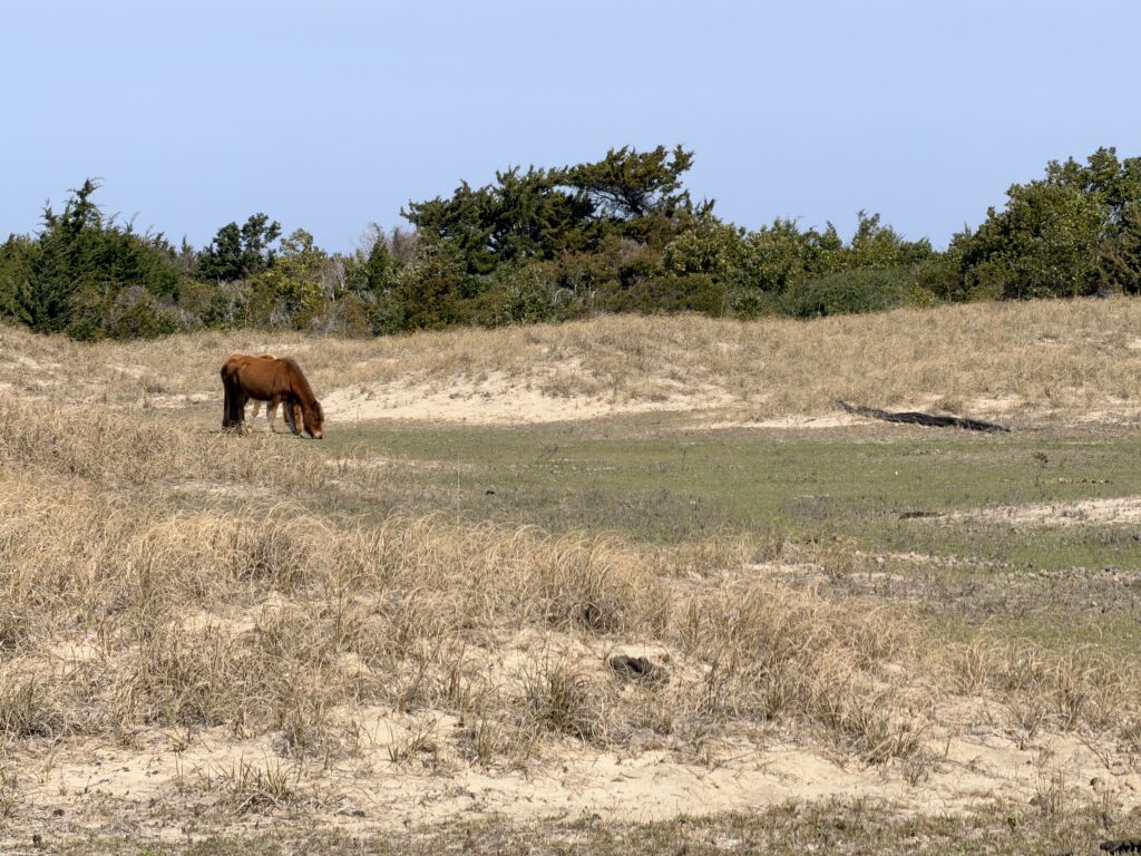 Saturday we checked out of our room and drove to Harkers Island. There we got on a ferry that would drop us off on an island called Shackleford Banks. It is home to wild horses that are said to be descendents of Spanish settlers. It is also supposed to be a good place to go shelling. We were more interested in finding the horses than finding shells. They just drop you off on the island and say good luck. You are all on your own when it comes to what yo7 do or which way you go. We headed inland to try to spot the horses. There were plenty of signs (poop) that they were around. Eventually, in the distance we spotted one. We put ourselves in a spot to see them better. It was so neat. We continued to explore the island and we ended up seeing 16 horses before we had to head back to catch our ferry to takes us over to Cape Lookout Lighthouse.