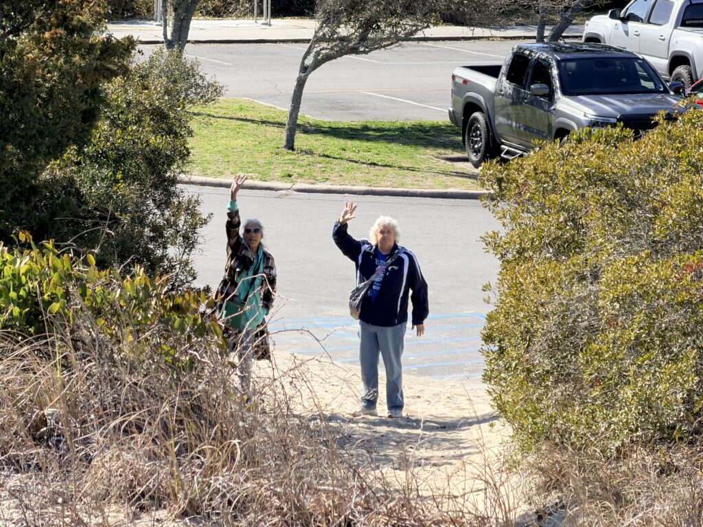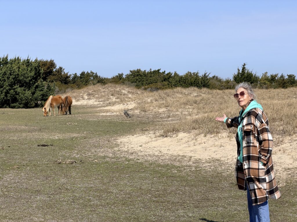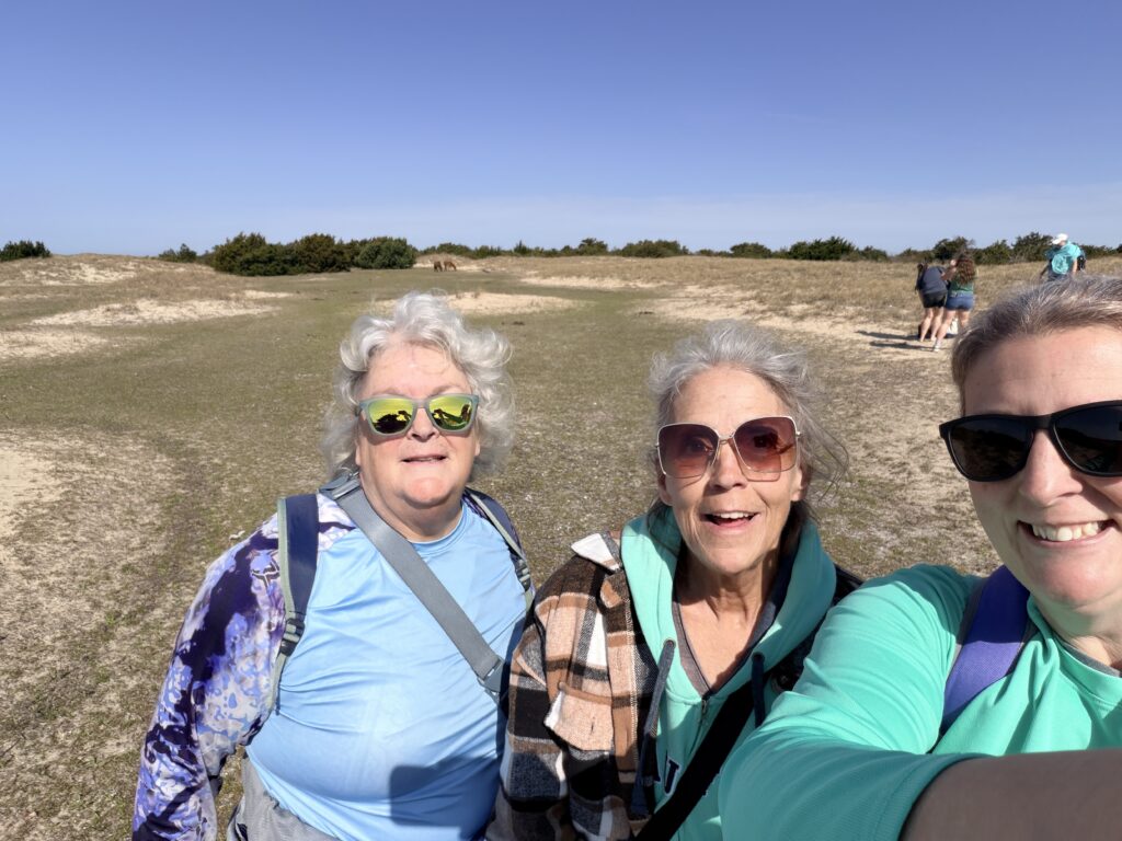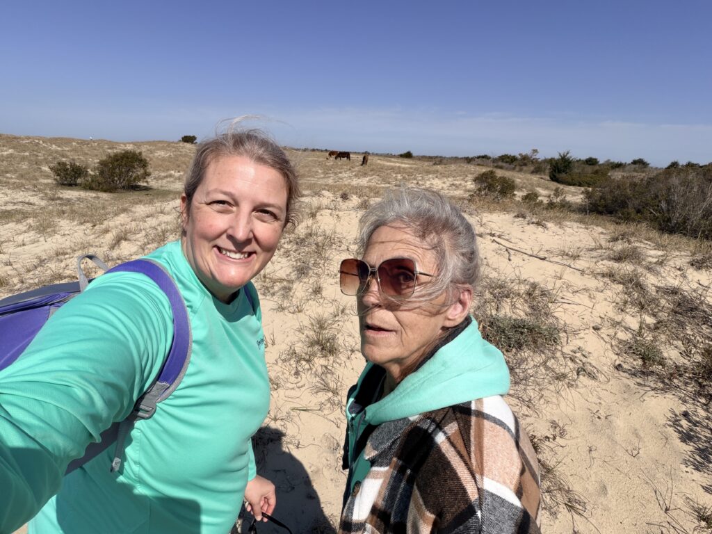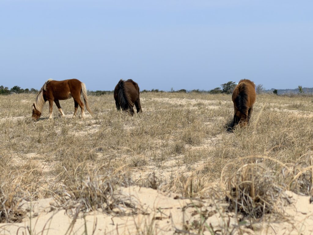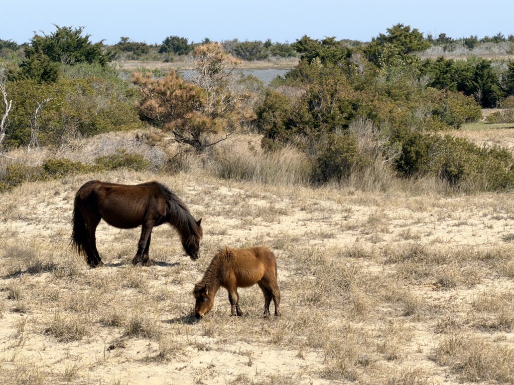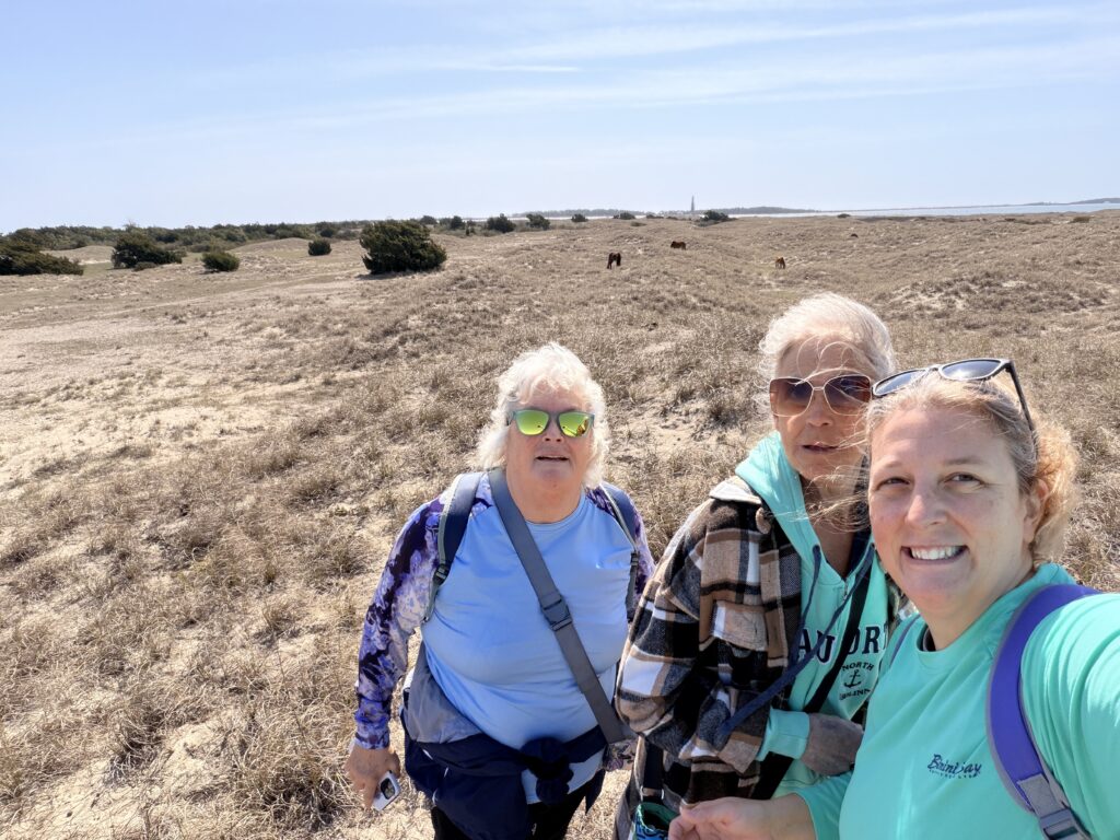 Saturday we checked out of our room and drove to Harkers Island. There we got on a ferry that would drop us off on an island called Shackleford Banks. It is home to wild horses that are said to be descendents of Spanish settlers. It is also supposed to be a good place to go shelling. We were more interested in finding the horses than finding shells. They just drop you off on the island and say good luck. You are all on your own when it comes to what yo7 do or which way you go. We headed inland to try to spot the horses. There were plenty of signs (poop) that they were around. Eventually, in the distance we spotted one. We put ourselves in a spot to see them better. It was so neat. We continued to explore the island and we ended up seeing 16 horses before we had to head back to catch our ferry to takes us over to Cape Lookout Lighthouse.